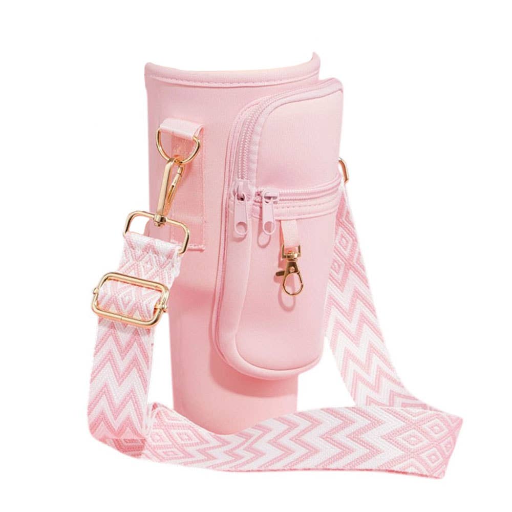 Stay hands-free and hydrated with this neoprene tumbler carrier, designed to fit most standard tumblers. Features an adjustable crossbody strap, secure zippered pocket for small essentials, and durable gold-tone hardware. Ideal for travel, walks, errands, and everyday on-the-go convenience.